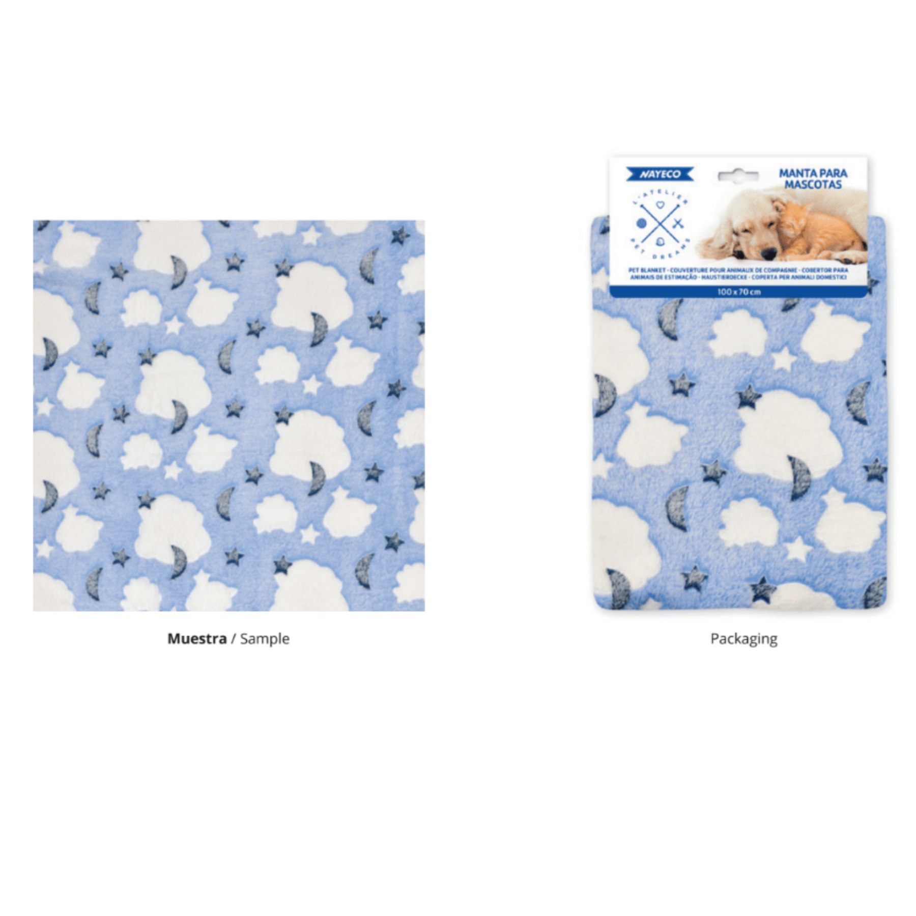 La Manta para Mascotas es la opción ideal para mantener a tu peludo cómodo y calentito en cualquier momento. Su diseño encantador de nubes y estrellas sobre fondo azul celeste no solo añade un toque decorativo, sino que también garantiza suavidad y calidez para tu mascota.